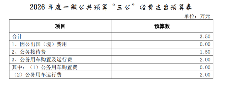 (三)公务用车购置及运行费 2026 年预算安排 2.00 万元,其中:公务用车运行费 2.00 万元,与上年持平;公务用车购置费 0.00 万元,与上年持平。 主要是保障公车运行维护需要。
